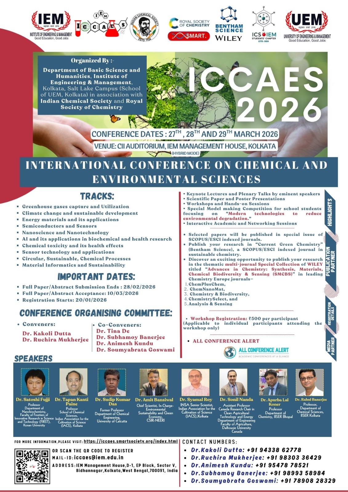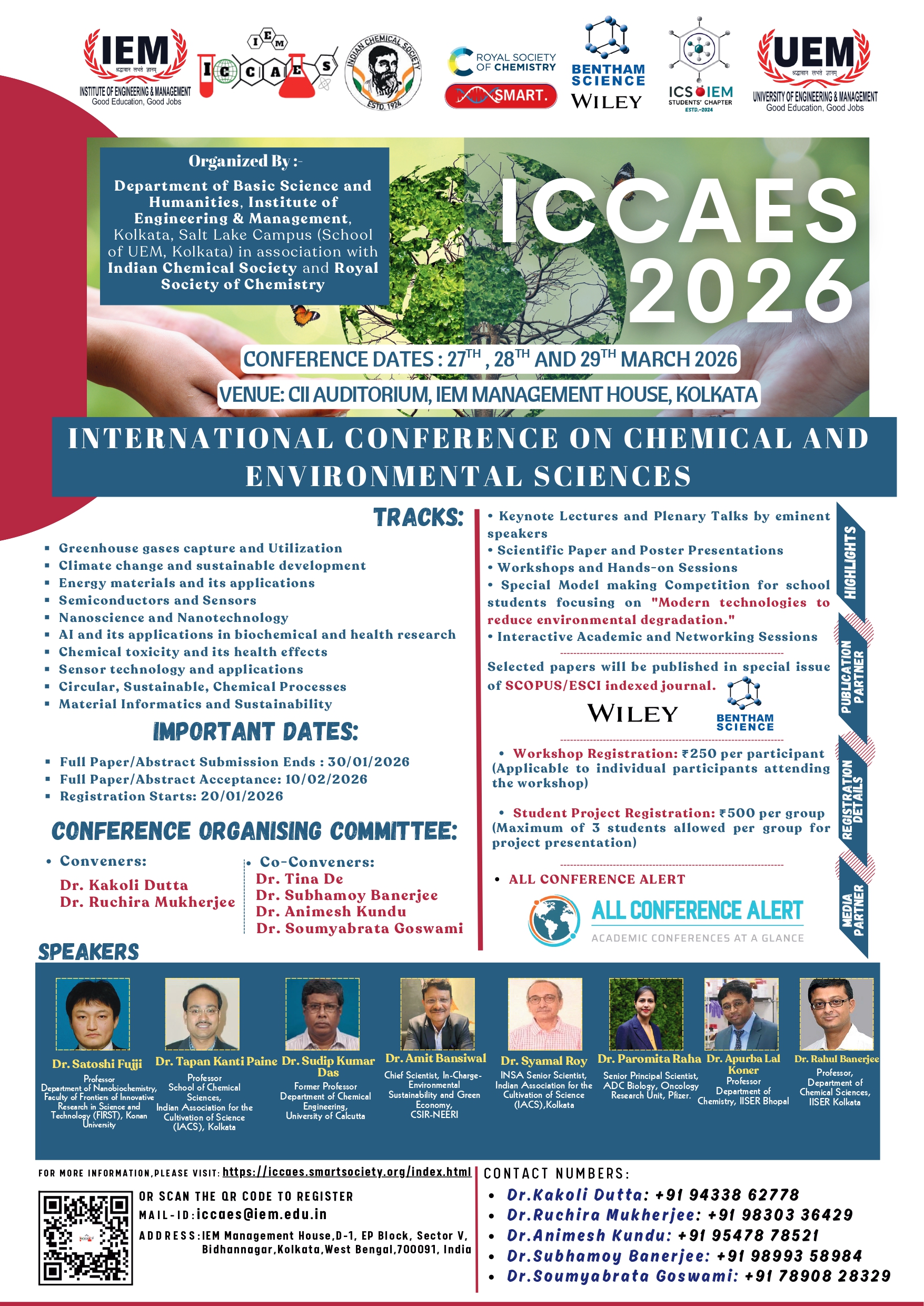 We welcome you to the International Conference on Chemical and Environmental Sciences 2026 (ICCAES 2026), scheduled to be held during 27, 28 and 29th March, 2026 in Kolkata, India. Selected papers will be published in special issue of SCOPUS/ESCI indexed journals (Wiley and Bentham Science).